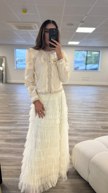 The skirt is full-length with a tiered, layered design made of soft net. The cascading ruffles create volume and movement.