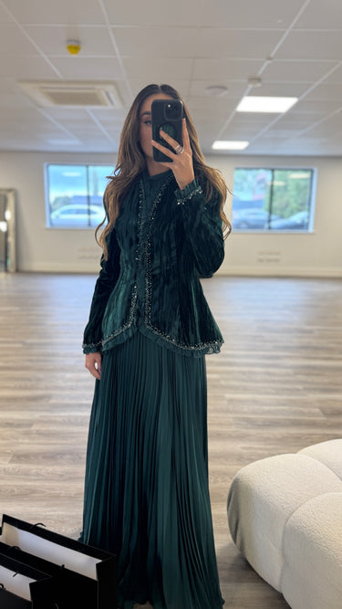 This outfit exudes sophistication and luxury. The contrast between the plush velvet top and the airy pleated inner dress creates a mix of structure and flow.