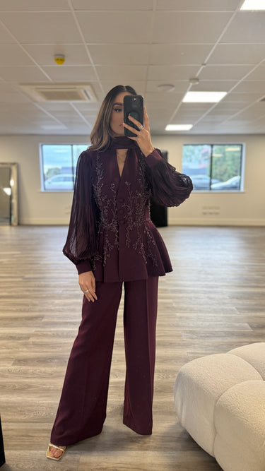 This is a sophisticated, clean-cut, powerful two-piece outfit. The jacket is a structured yet slightly flared silhouette that cinches at the waist, giving a flattering shape. It has button closure at the front for a refined look and intricate bead embroidery around the waist and hips. The long, sheer pleated balloon sleeves with fitted cuffs, adds drama and sophistication while contrasting beautifully with the structured body of the jacket.