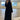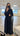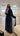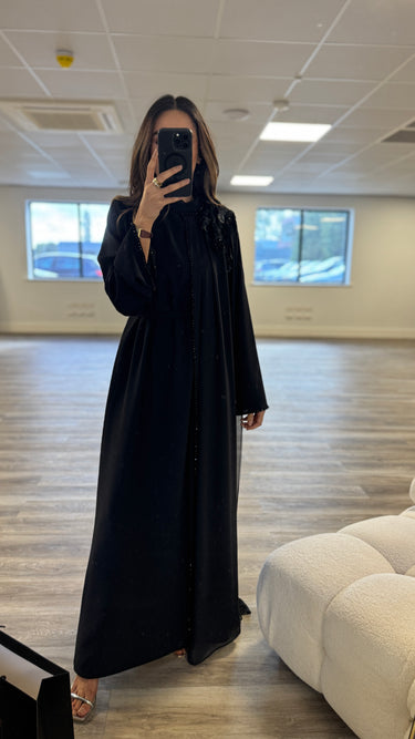 A long, elegant abaya-style dress, modest and flowing. It has a high neckline and straight sleeves adorned with small black bead embellishments. A long fabric piece extends from the neckline down the front and back with 3D floral appliqués on the shoulder.